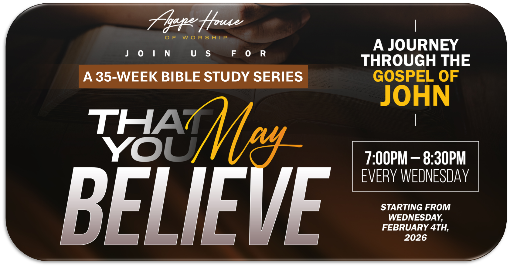 We invite you to join us tonight at Bible Study as Pastor Jide Lawore kicks off our new 35-week study series titled THAT YOU MAY BELIEVE: A Journey Through the Gospel of John.